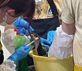 Un guillemot mazouté en train d'être lavé en centre de soins pour retrouver son étanchéité. / ©Romain Morinière - LPO