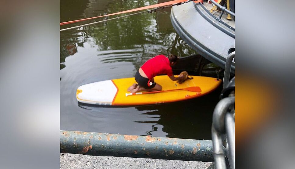 « Elle a réussi à trouver un endroit sec sur l'hélice d'une péniche. Sorti de nulle part, un voisin est apparu avec… sa planche de surf ! »