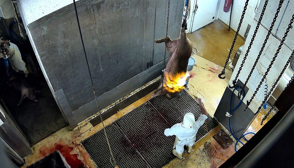 D’après les images révélées par les lanceurs d’alerte, des cochons encore vivants sont brûlés au chalumeau. /©L214