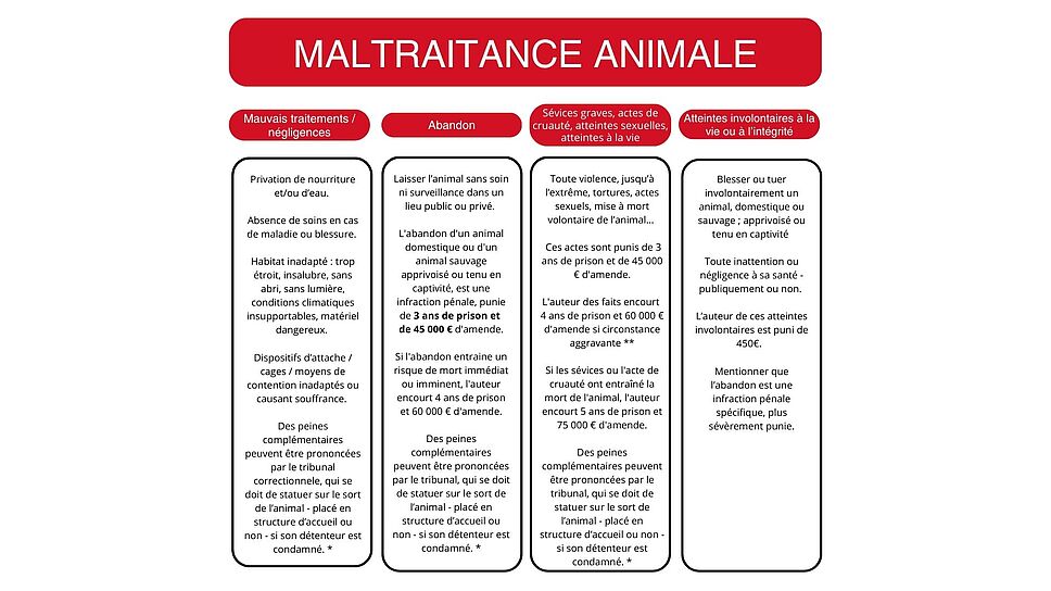 Chaque année, des milliers d’animaux sont battus, abandonnés, torturés. Et pourtant, la réglementation encadre la maltraitance animale. La loi du 30 novembre 2021 renforce ainsi les sanctions applicables en cas de sévices graves, d’actes de cruauté et d’abandon - contre animaux domestiques, apprivoisés ou tenus en captivité - passibles de 3 ans d’emprisonnement et 45 000 euros d’amende. Si l’acte entraîne la mort de l’animal, la peine est portée à 5 ans de prison et 75 000 euros d’amende.